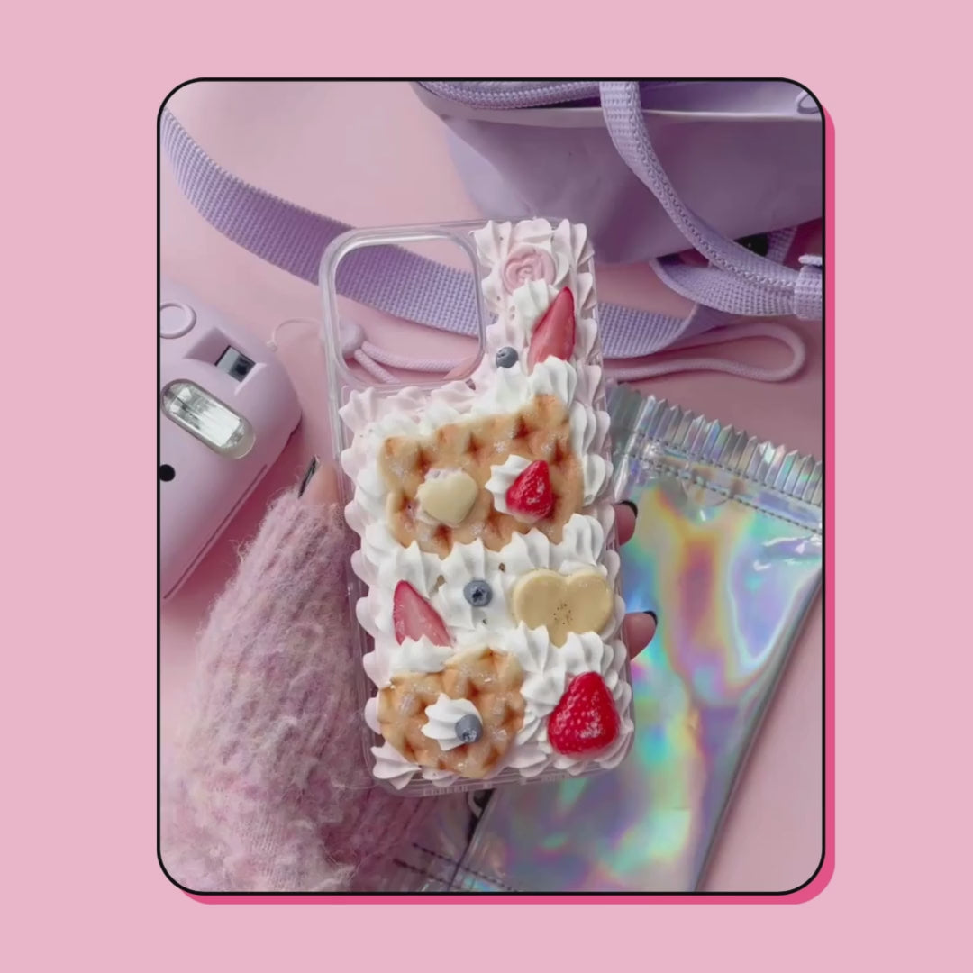 cat & heart shaped waffles decoden phone case with strawberries, blueberries and bananascat & heart shaped waffles decoden phone case with strawberries, blueberries and bananas