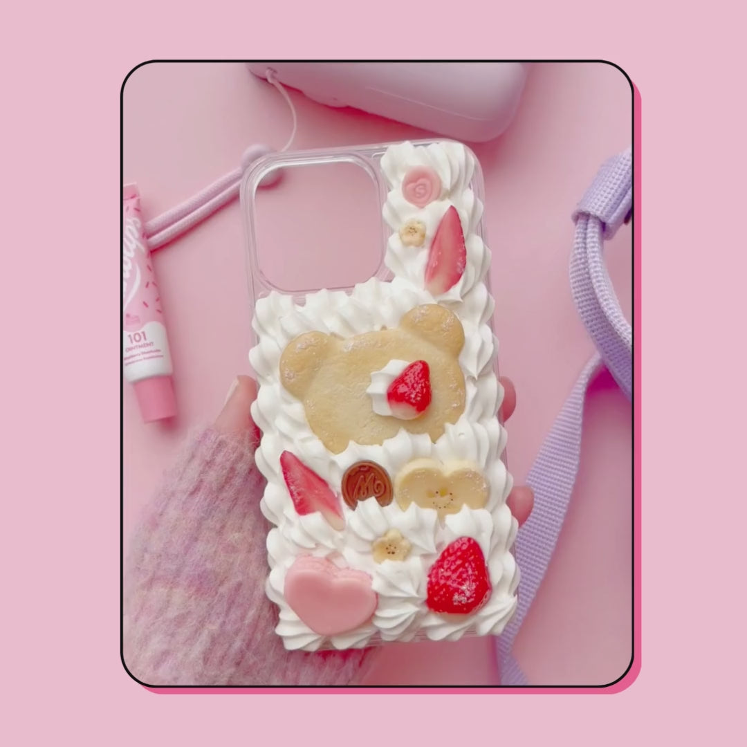 clear phone case featuring piped whipped cream shells, teddy bear shaped butter cookie, strawberry slices, banana flowers, strawberry pink heart shaped macaron and custom chocolate letter motif ♡