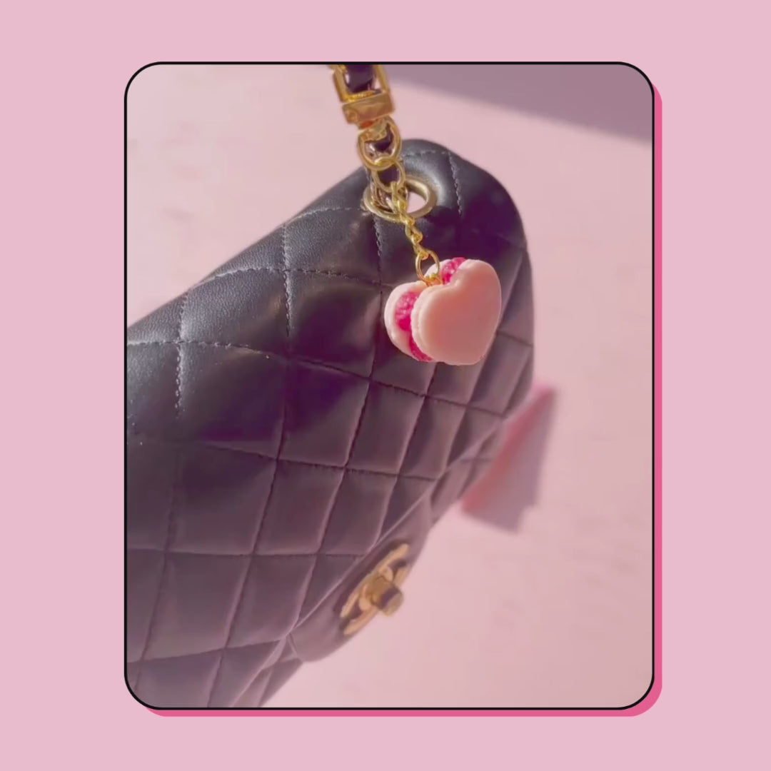 ♡ keyring featuring heart shaped pink macaron filled with fresh raspberries